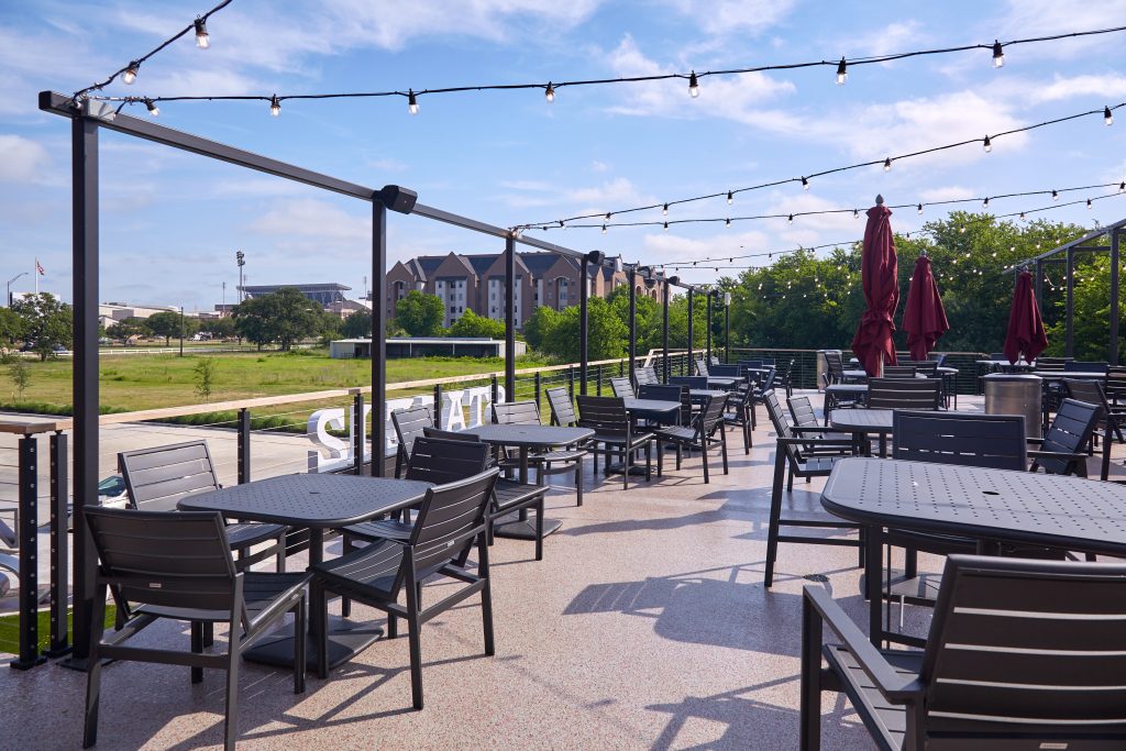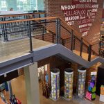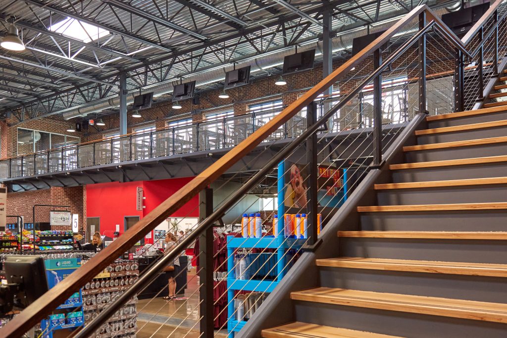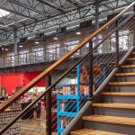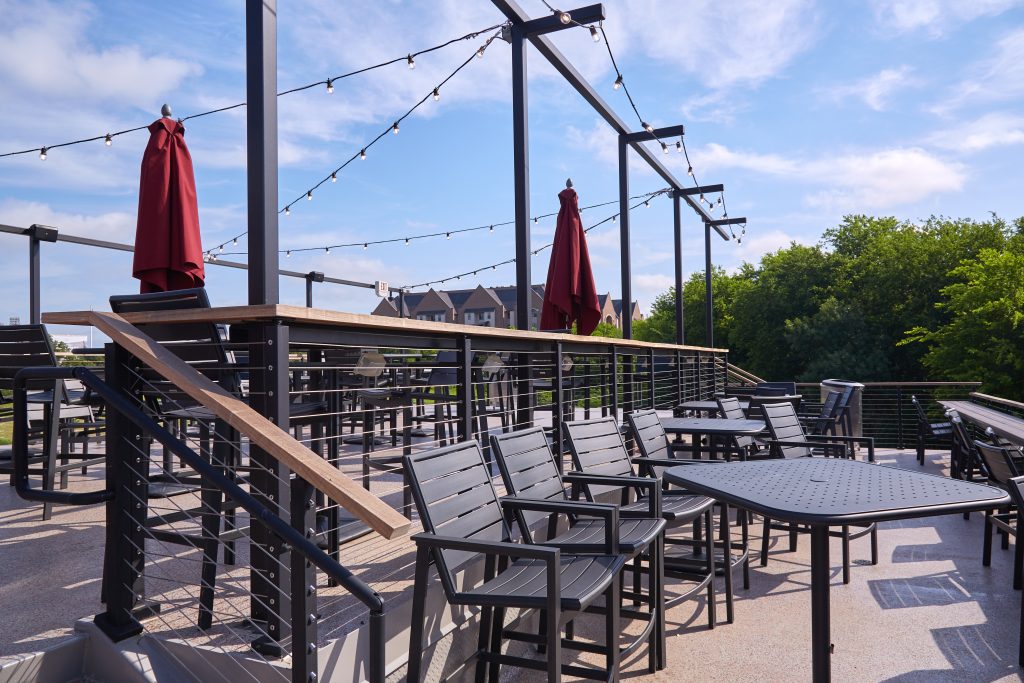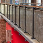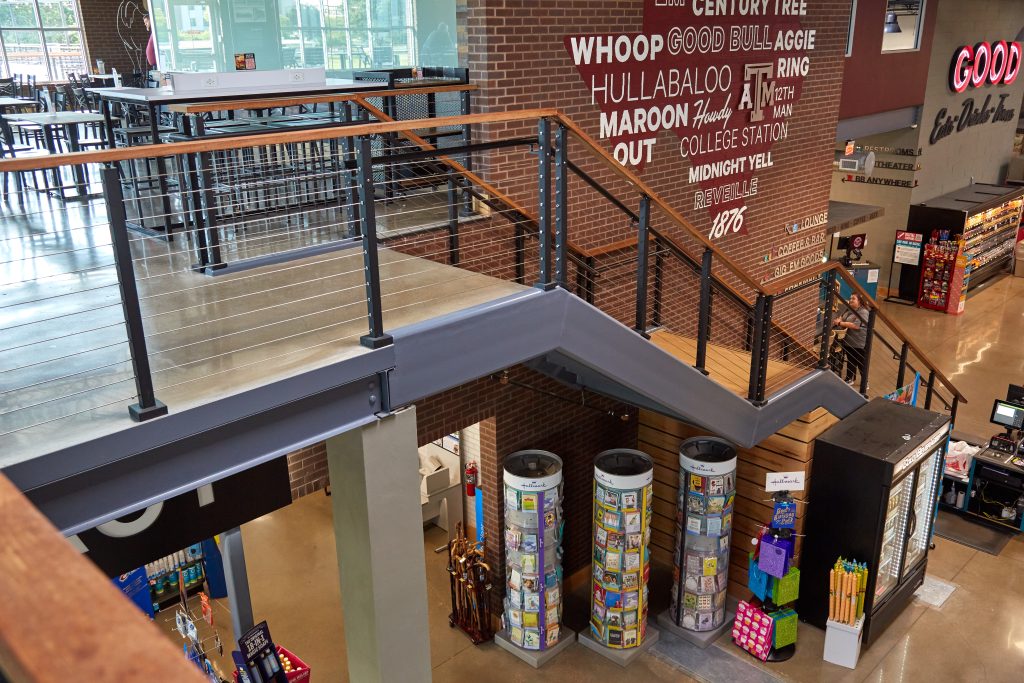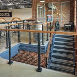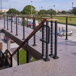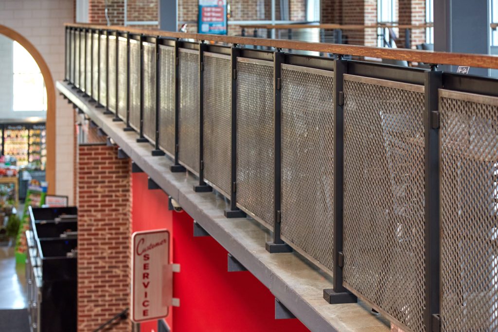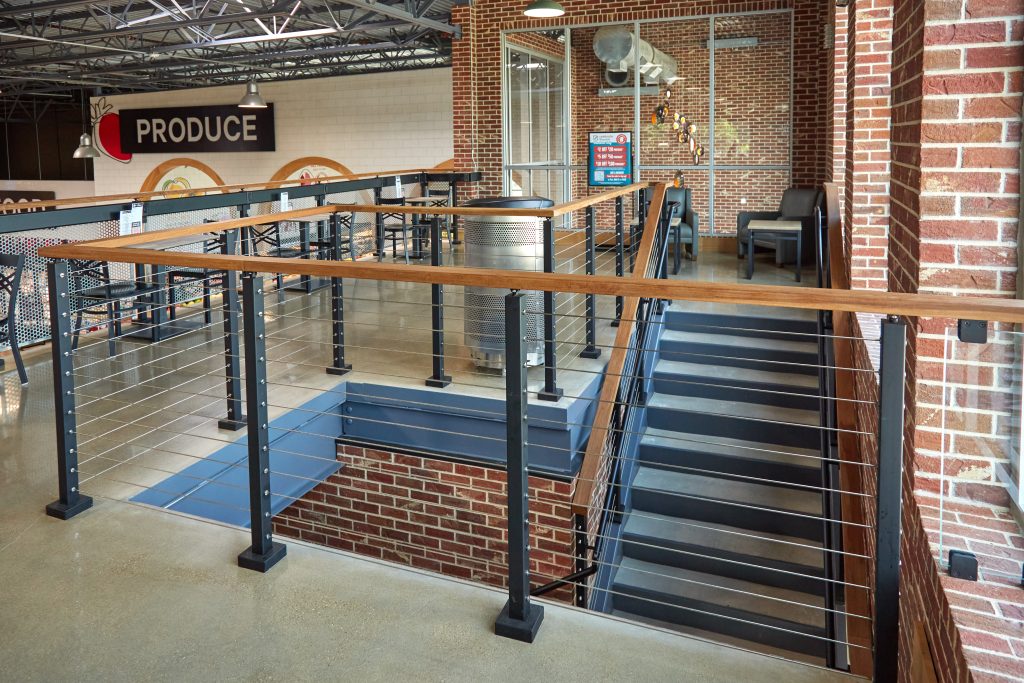 Ever thought of using posts meant for glass to install a sheet of metal poked with holes? Check out how this grocery store in College Station, Tex., did just that. This cable railing with black powder-coated posts fits the country atmosphere of the Brookshire Brothers chain, but adds a modern twist. One of the more interesting parts of this project is how they used clips – which are normally used on our glass railings – to hold up the perforated metal paneling on their balcony. Using the glass clips allowed the space to stay free of clunky hardware and keep the unique paneling as the star.