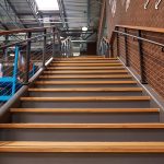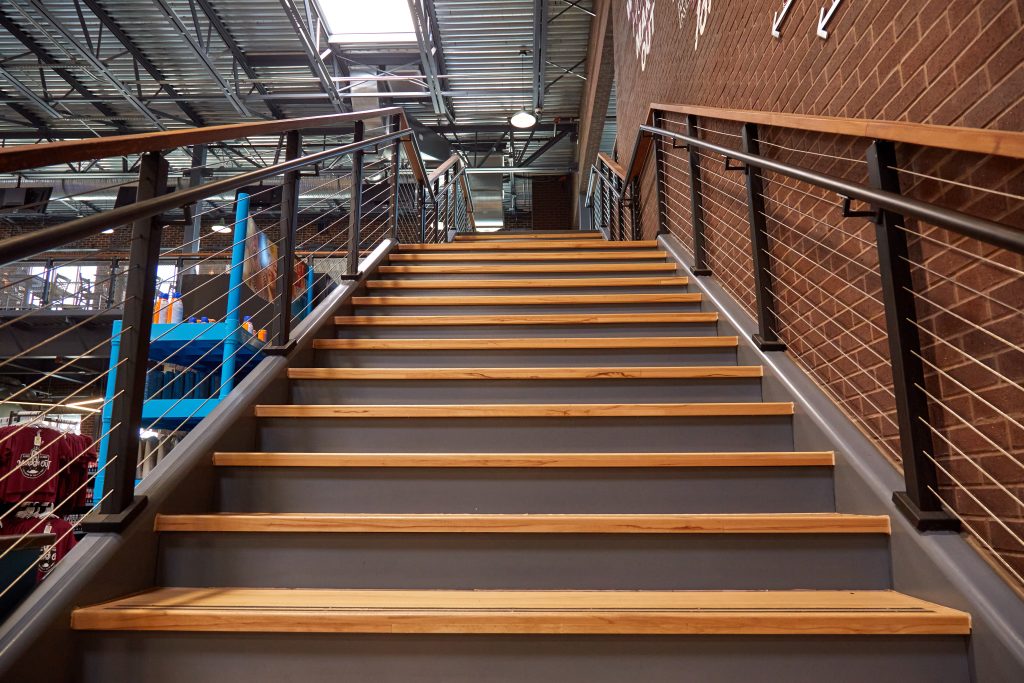 The stair railing and the exterior railing are great examples of a commercial cable application paired with Ipe handrail. Ipe is one of our most durable wooden handrails. Because of the strict guidelines in place for public buildings, the client also used our Stainless-Steel Handrail which you can see is set lower on the railing.
