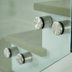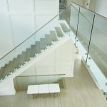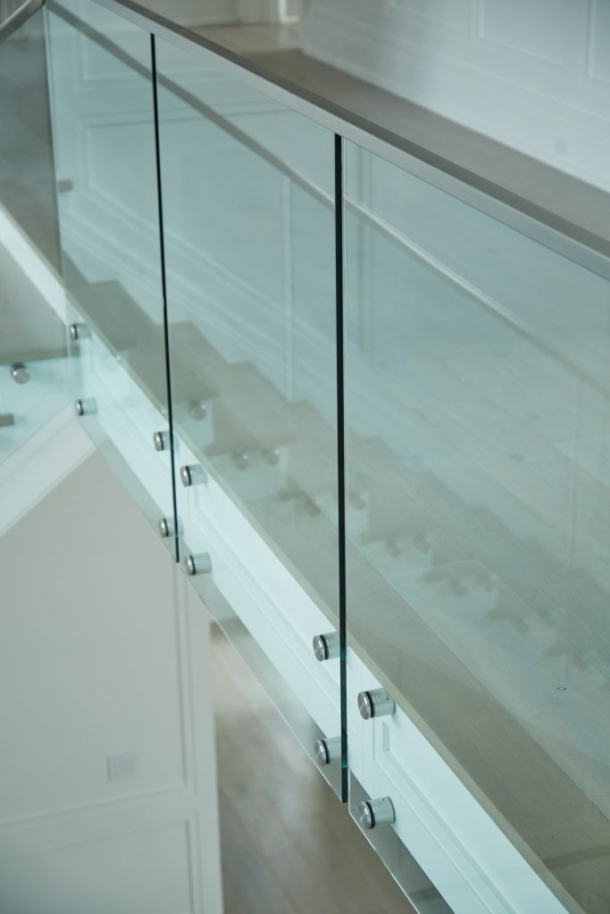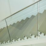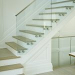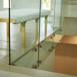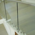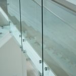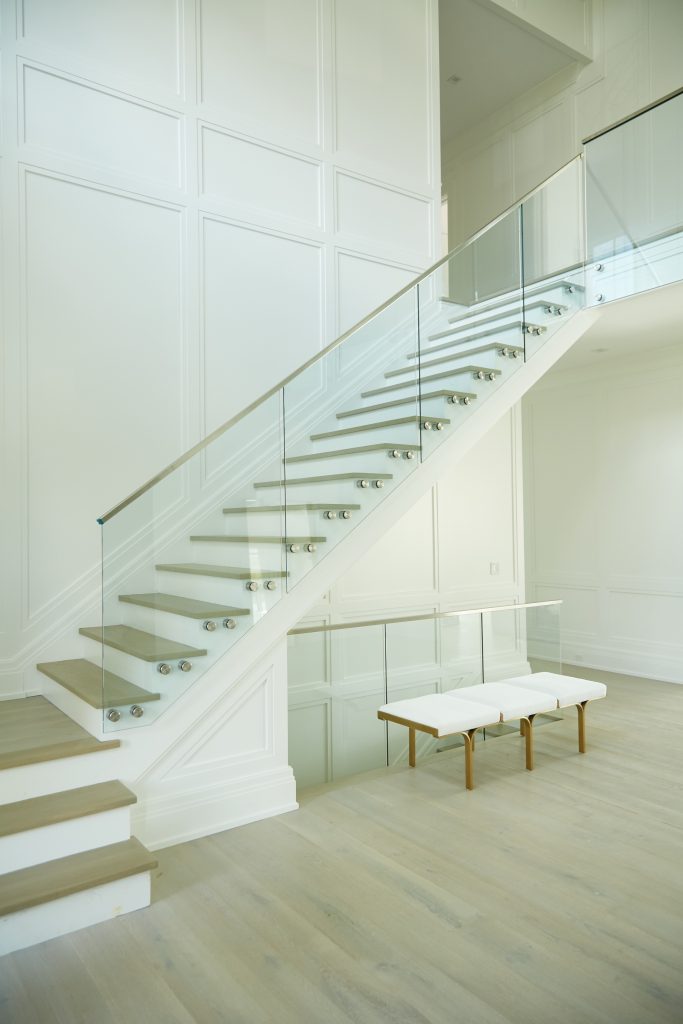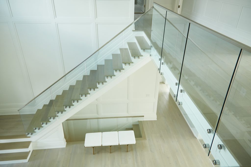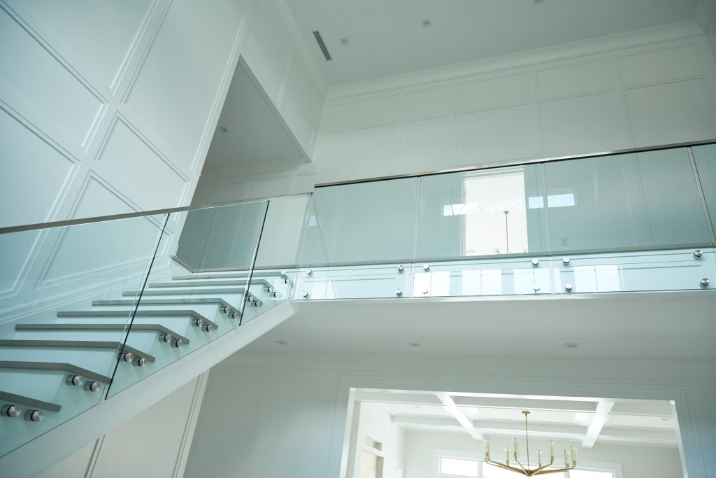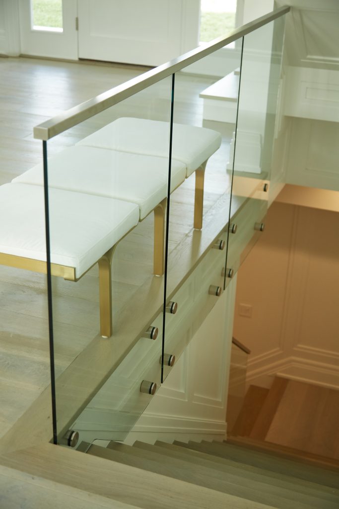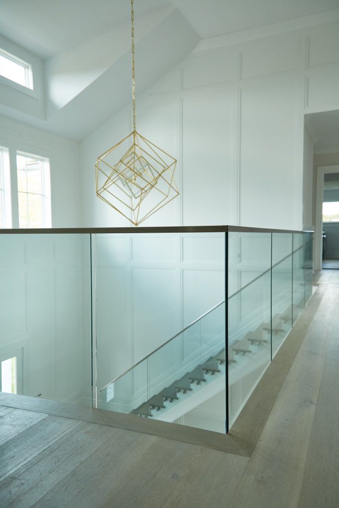 With its slim profile and clean, crisp look, glass railing will give any staircase a modern flair. This home in Southampton, NY features elegant glass railing paired with a stainless steel graspable metal cap and our innovative standoff pins. Clear glass panels provide a natural complement to this space’s already minimalist, open design. This foyer is truly a masterpiece.