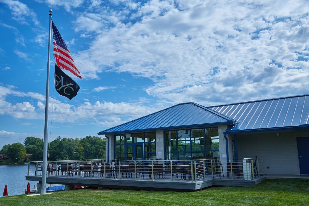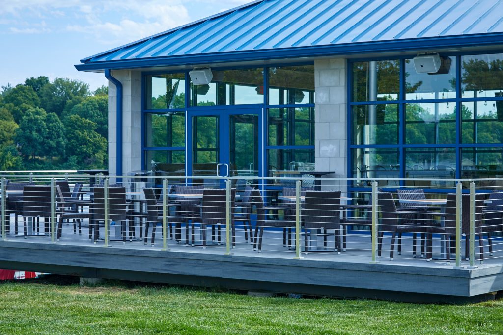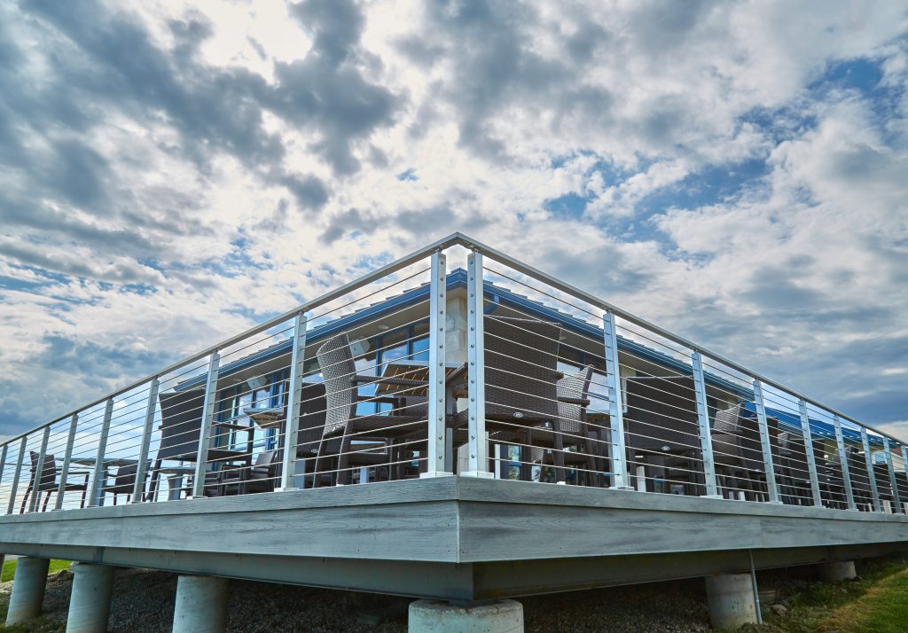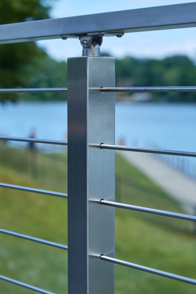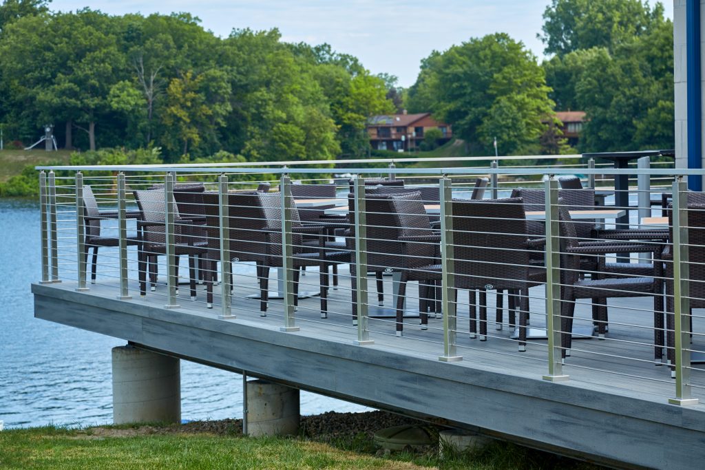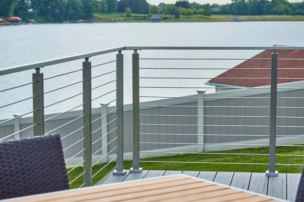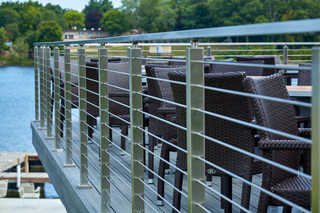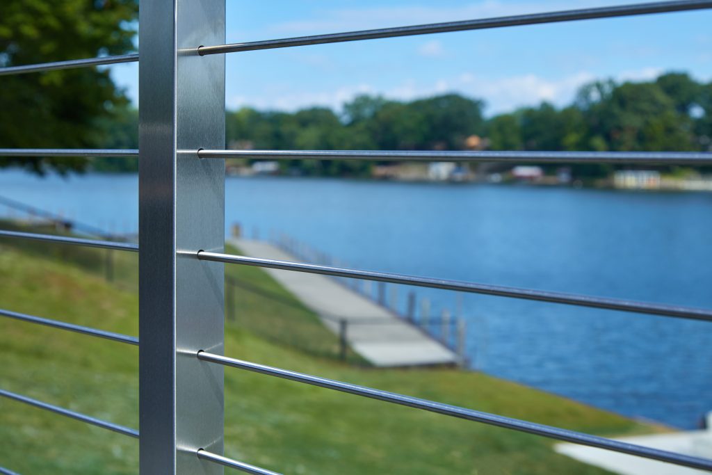 This gorgeous system was installed at a yacht club in Bellevue, Michigan, and shows off everything we love about rod railing. Its fluid, parallel lines blend with the view of the lake in the background while also complementing the gray tones of the deck. A sleek stainless steel handrail tops off the system — practically shining against the backdrop of lake and sky. This stainless steel rod railing system is simple, modern, and of the highest quality.
