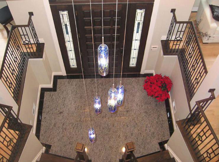 This stairway features our designer series of iron balusters along with a premium ranch style box newel post . Also, notice how the customer decided to run their handrail straight into the wall on some of the balcony sections, rather than completing the run with newels (only shown in the second picture). Click here to view your entire Designer Series Iron Baluster offering.