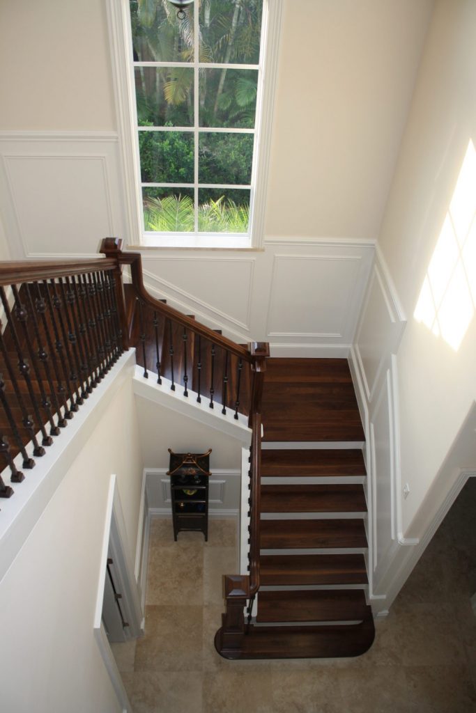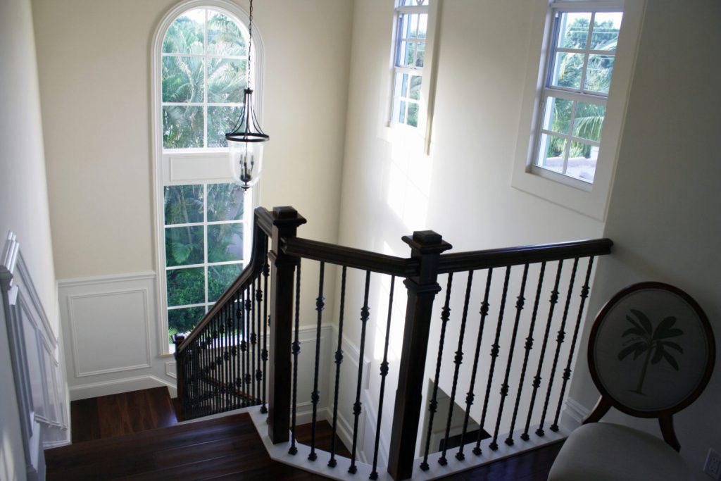 This stunning home features a large staircase with several flights of stairs. The beautifully crafted wood stair parts provide contrast against the white walls and risers. Furthermore, this railing highlights an elegant iron baluster design from our forged series. Using the single and double knuckle balusters side by side gives addition visual interest to this lovely banister. To see what wrought iron baluster design suits you, you can use our iron baluster design tool. This tool allows you to drag and drop different balusters into a virtual space, allowing you to compare and contrast baluster layouts. Furthermore, our team of sales representatives is happy to answer your baluster design help questions.