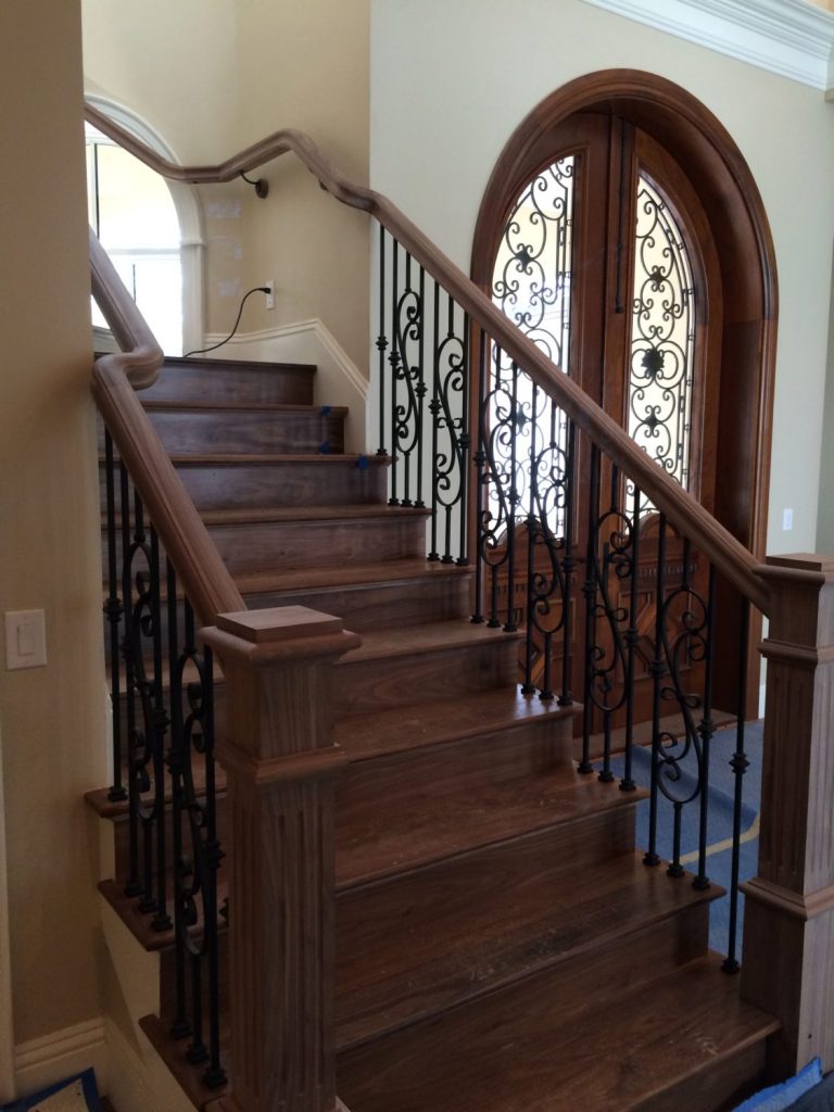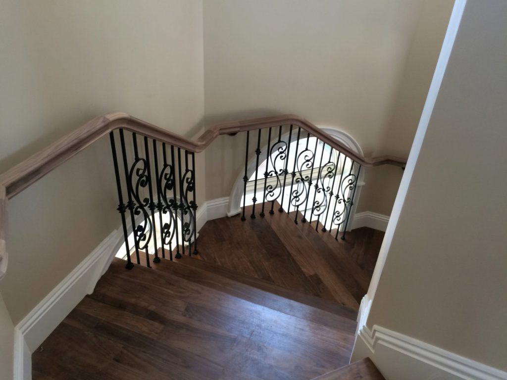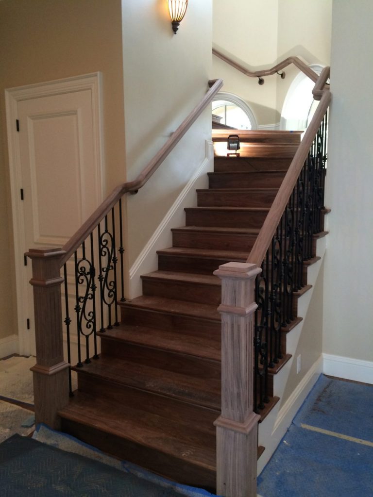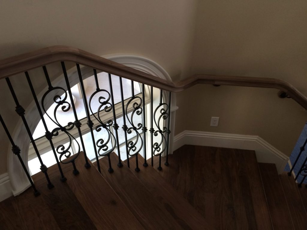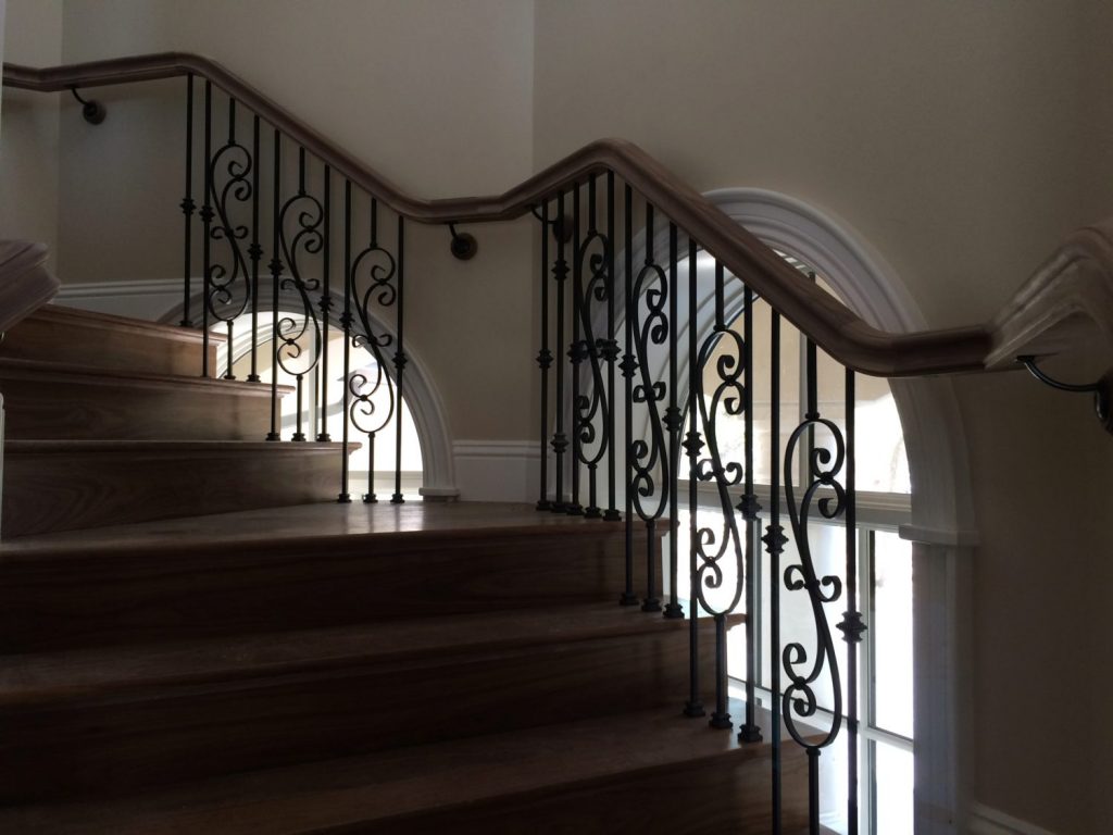 If you are looking to add an extra touch of elegance to your stair railing, scroll series wrought iron balusters may give you your desired look. In these photos, you can see the decorative scroll iron balusters placed between single knuckle balusters. This provides space between the scrolls so you can have a visually pleasing design. You can use iron balusters with box or turned newels to add classic flair to the interior of your home.