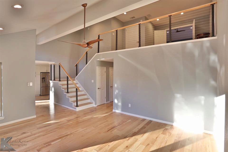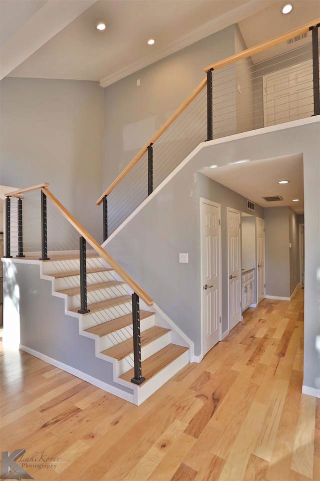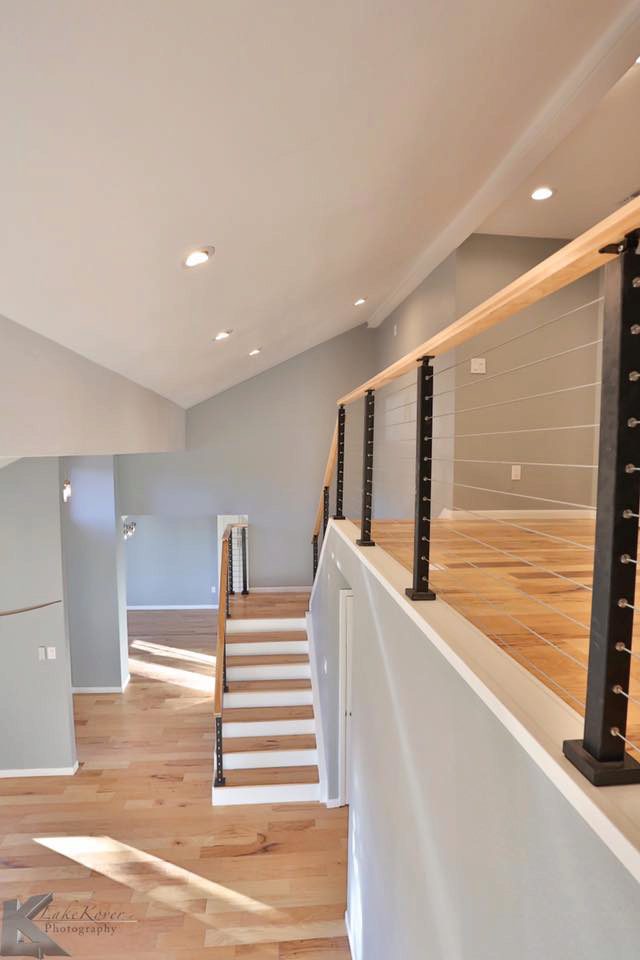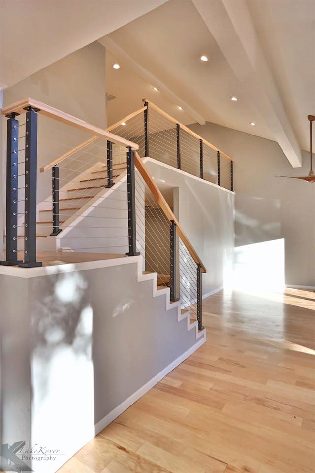 Some projects utilize multiple cable railing post styles. In these photos, you can see an example of a home that used both angle and flat foot universal top posts. The customer chose angle foot posts for the second flight of stairs so that they could be mounted to an angled knee wall. However, the level runs and the first flight of stairs use flat foot posts. Fortunately, these two posts styles work together harmoniously so that the result is one, smooth cable railing system. If you have a project that will require multiple post styles, you don’t have to worry. Our posts can work together to create a cohesive, unifying look for you to enjoy.