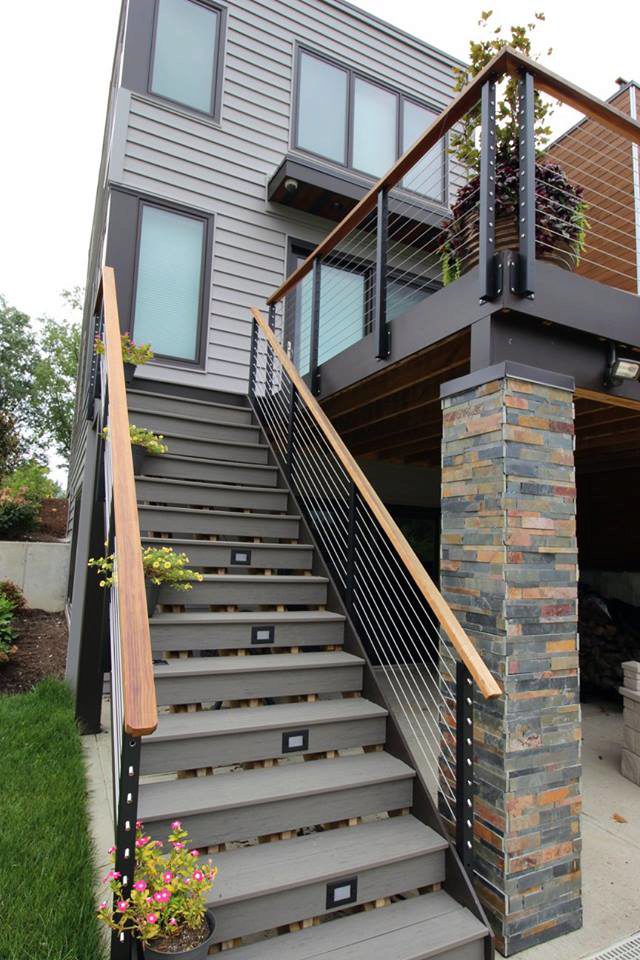This modern home features many contemporary design features like rectangular rooms and decks. These features compliment cable railing systems. Furthermore, the decks serve as entertainment spaces with fantastic views. This makes them a perfect place for cable rail. The practically invisible cable allows you to enjoy the view. In addition, the railing provides ample support for the deck. If you have an exterior entertainment space, consider using cable for your railing. If you do select cable, you’re sure to enjoy the views and breezes that your new railing allows into your space.