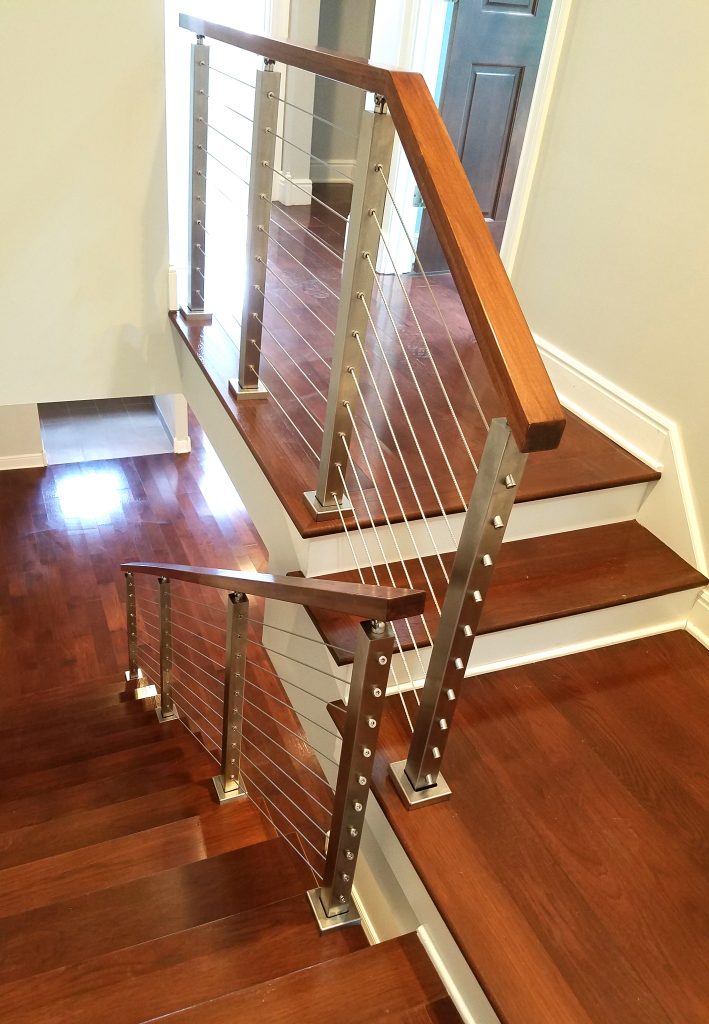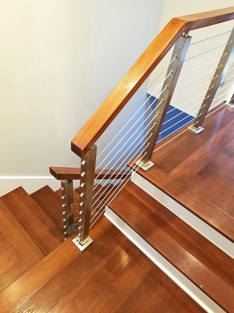 This home in Pennsylvania has a dazzling stainless steel, custom cable railing system that ties the modern, open feel of the house together. For this project, the customer combined the clean aesthetic of brushed stainless steel with the contemporary design of a 6000 mission style handrail. For the handrail, the customer selected Hickory wood that has rich color and beautiful variation. The angle of these stairs was slightly less steep than what is standard. However, we were able to use our cable railing tension kits and components to get the job done. If you have a unique angle on your staircase, don’t let it scare you! Our experienced team would be happy to quote a project for you with the right, customized materials for the job.