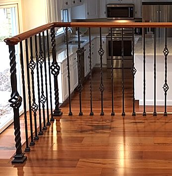 This spacious home uses the elegance of wrought iron balusters and the character of tigerwood handrails to achieve their gorgeous design. The featured balusters are from the twist series, which is the most popular of our vast selection. In addition to the balusters, these customers elected to use iron newels rather than wood ones. Here the single basket dual twist newel blends in seamlessly with the rest of the design. Though from a distance these balusters nearly appear black, they are actually brushed bronze. This allows them to fit in harmoniously with the colorful wood floor around them.