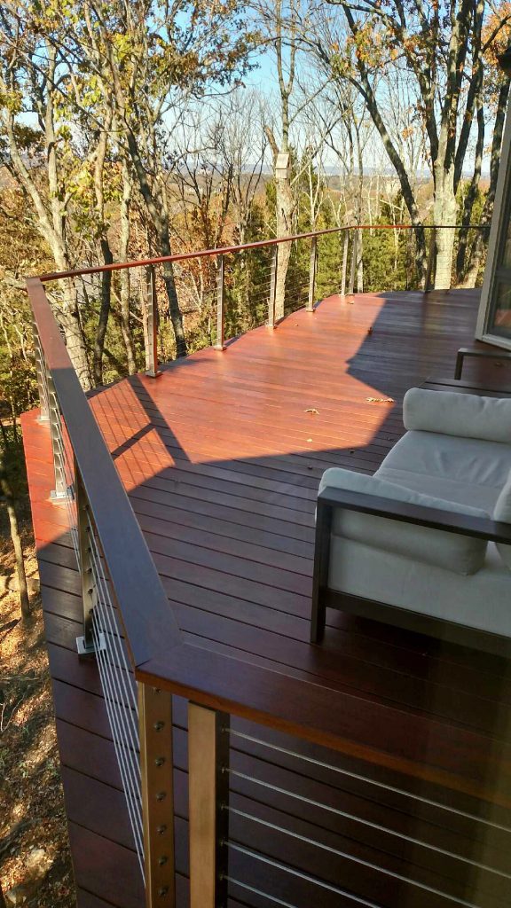 This home in the heart of Nashville boasts outstanding views of the rolling mountains. The brushed stainless steel posts catch and reflect the glistening sun. Concurrently, the wood handrail makes the system cohesive with the natural surroundings. In his design, this customer elected to double post the corners of this deck to provide extra durability and tensioning strength to the system. In this scenario, the doubled posts remain sleek and allow the full view to shine through.