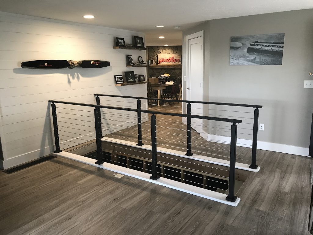 When properly staged in a well-designed home, cable railing becomes more than a beautiful safety feature. These cable railing creations transform into works of art. In this project, the customer used the sets of cable railing to frame the airplane propeller on his wall. This makes the cable railing a part of the entire layout of the living space. The black posts compliment the monochrome style of the room. In addition, the metal handrail adds an extra-modern touch. Put together, the stylized room is ready to impress.