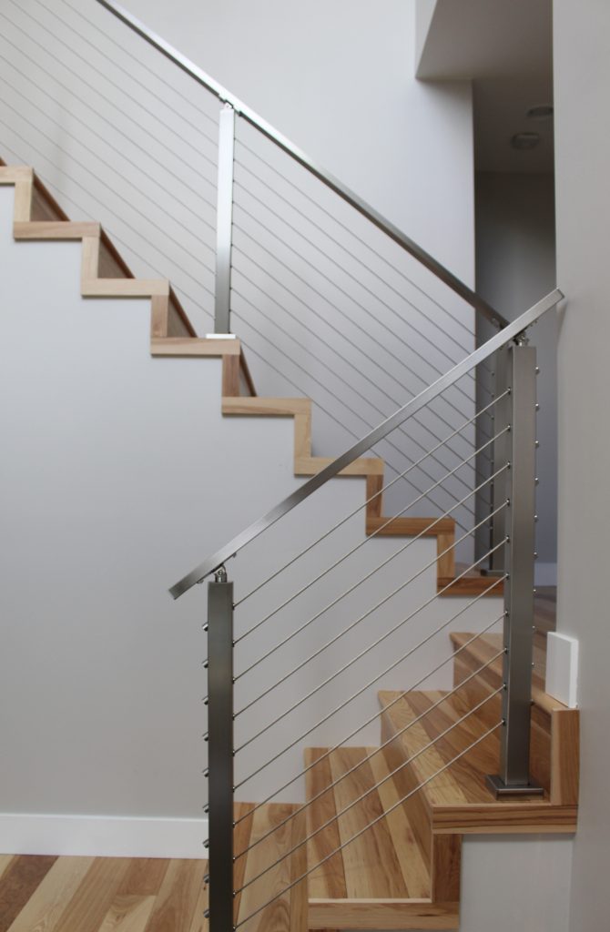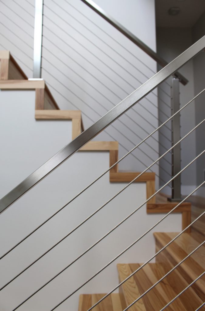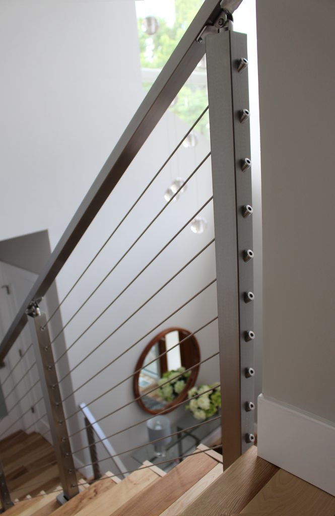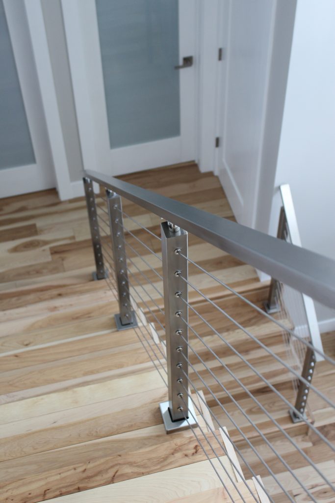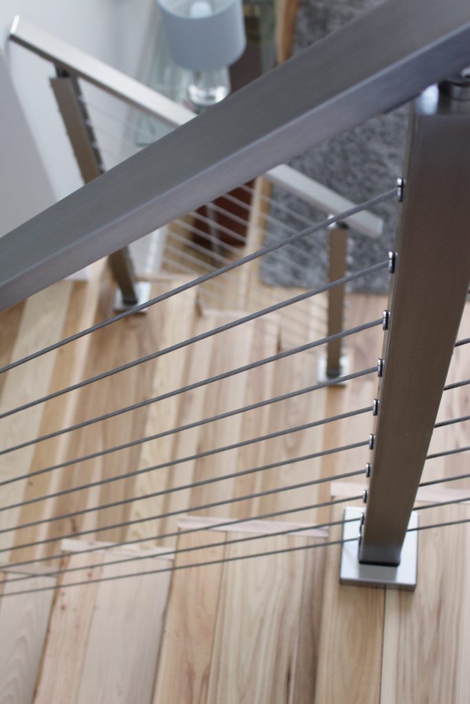 “The cable railing provided the modern feel we were looking for and was an economical, but still customizable, option to a hand-made railing from a local company. We opted for the smoother cable for a cleaner, more elegant, look. Instead of choosing a wooden handrail, we chose the stainless steel because we wanted to keep the beauty of both the railing system and floor separate. The contrast between the wood and metal would not have been as striking if the two were melded together.”