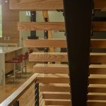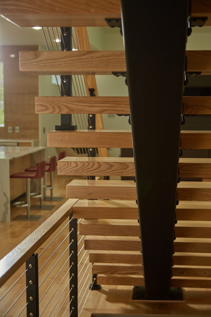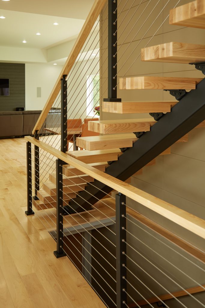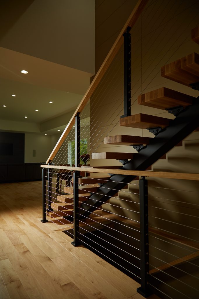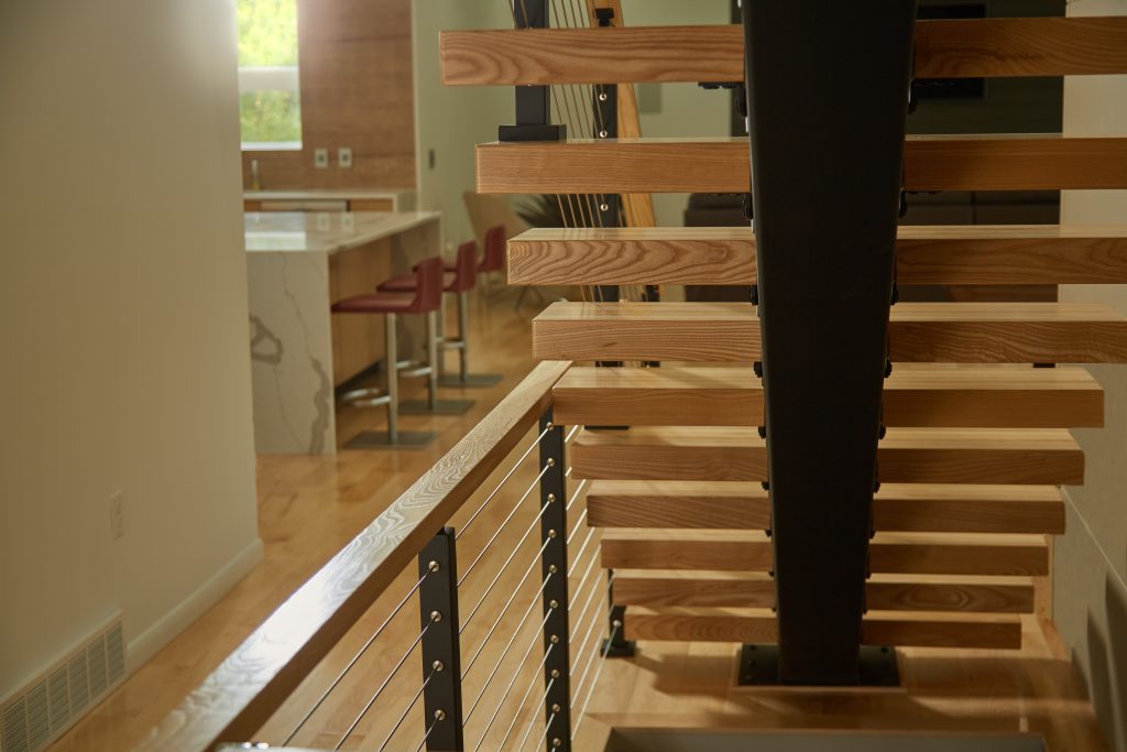 Our sleek, Mission-style Ash handrail coordinates perfectly with the treads and contrasts the sturdy black posts. A powerful black powder coated steel stringer holds the entire system up. This sleek, modern, and high-quality floating stair system is an eye-catching centerpiece–a conversation starter for years.