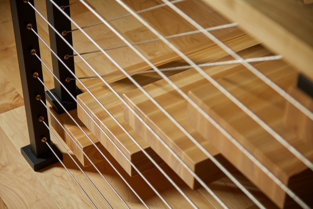 Installed in a home in Garrettsville, Ohio, this FLIGHT floating staircase shows off our beautiful Ash Thick Stair Treads. Light color and a highly defined grain pattern makes these treads pop against our black aluminum cable railing posts. Better still, the treads helped these owners keep their costs low, as Ash is a budget friendly alternative to more expensive wood types.