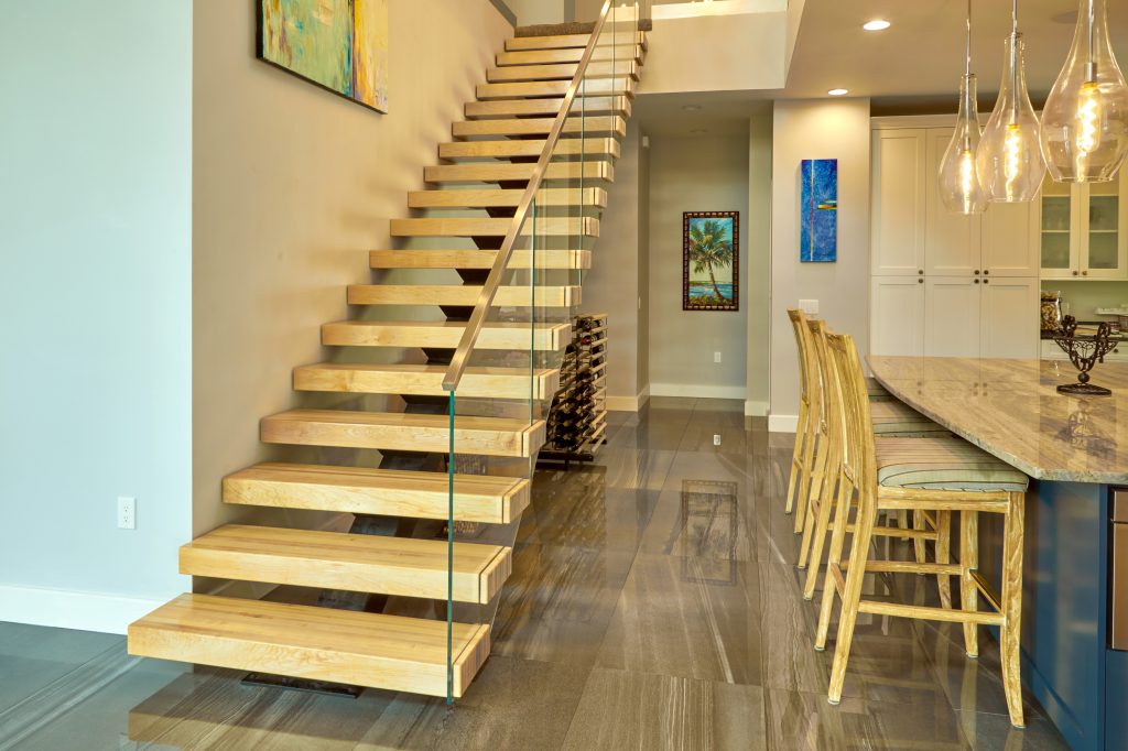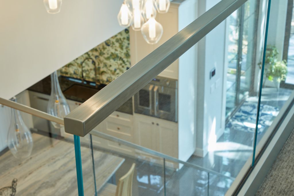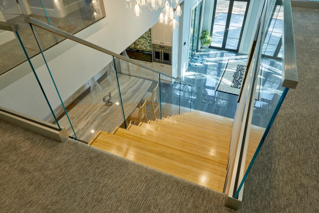 In this amazing Floridian house, the homeowners were interested in a railing system that not only worked in, but emphasized, their open space. With huge floor to ceiling windows, the low iron glass lets the natural light into the entire house. The Vedera FLIGHT system ties together the first and second floor with its unique, minimalistic structure. Each tread slice conceals the glass fasteners, creating a system that seems to flow together.