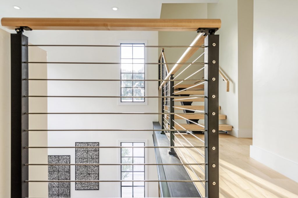 The Viewrail FLIGHT floating stairway system includes black mild steel stringers, built in hockey stick shape, 3-3/4” thick hard maple treads with clearcoat finish, aluminum surface mount posts with black powder coat, 2205 stainless steel rod railing, and round, hard maple handrail with a flat bottom and a clear finish. There are two matching landing platforms with the finish selected to match the flooring.