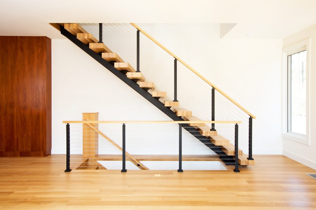 Viewrail took the size, color, and species information and proposed a system consisting of a black mild steel stringer, finish-on-site white oak treads and mission-style handrail, with black powder coated aluminum posts to support the cable railing.