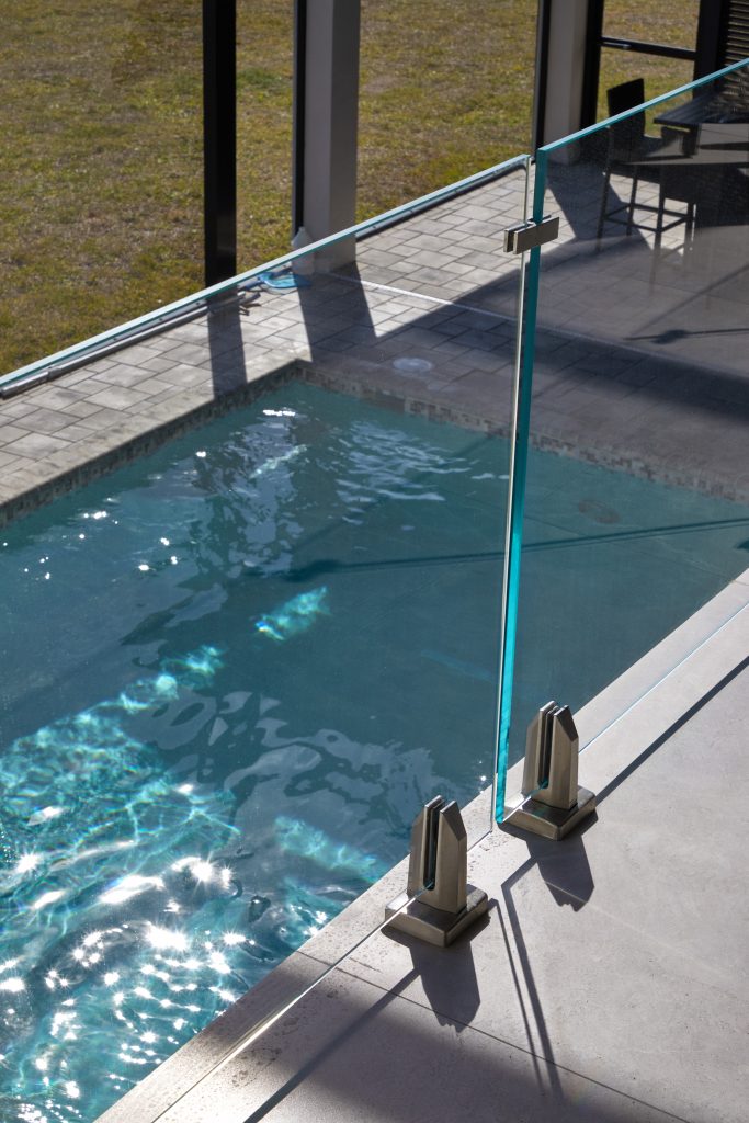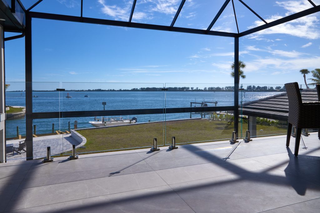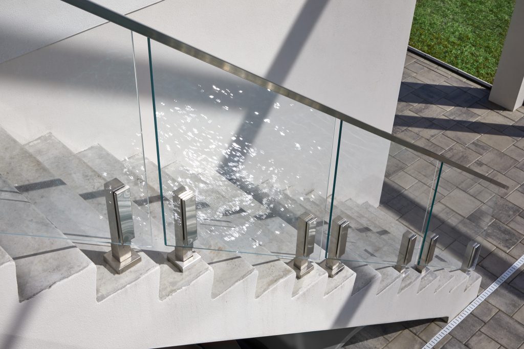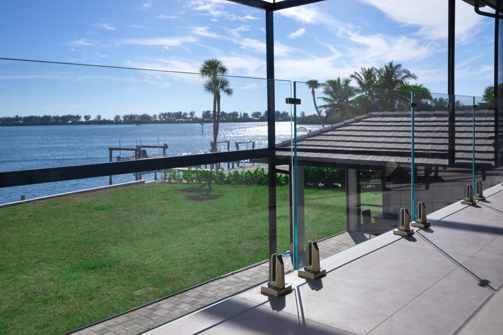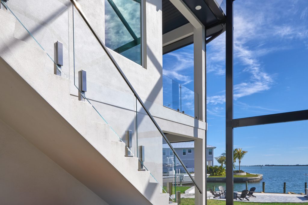 With a view as beautiful as this, the best option for a modern railing was clearly glass railing. The minimal, frameless glass supports help emphasize the gorgeous view. Ascend Talons constructed from 2205 Stainless Steel are used for the stair railing, with a metal rail on top. The 1.5″ glass cap rail creates a perfect, code complaint graspable handrail. For their level railing, these homeowners used low profiled Surface Mount Talons with low iron glass railing. This railing perfect matches the modern, light style of the home.