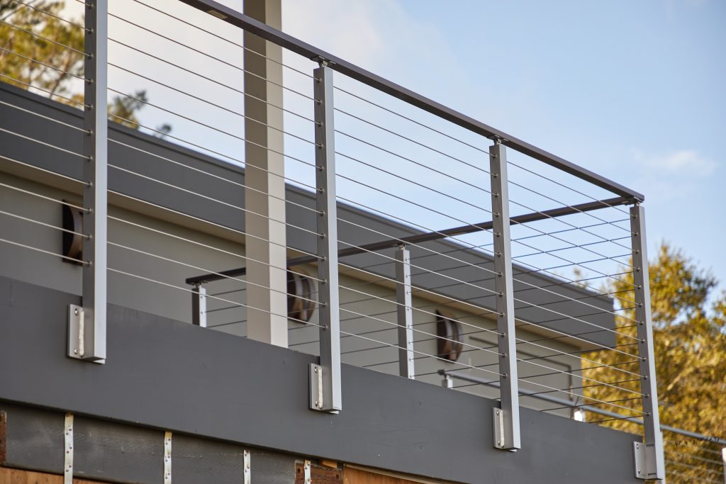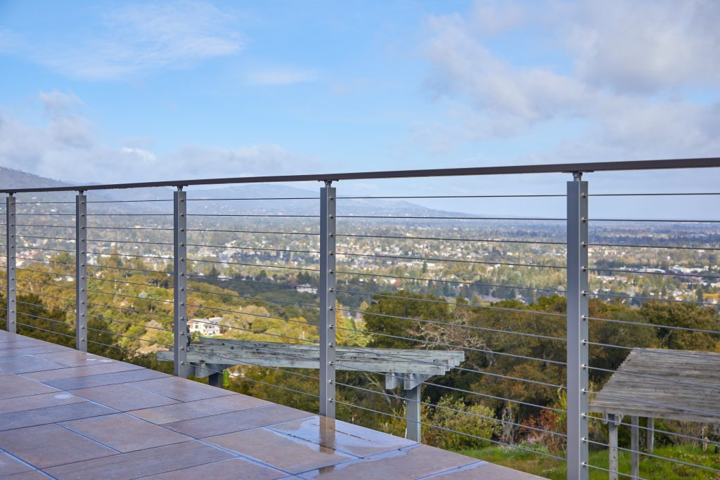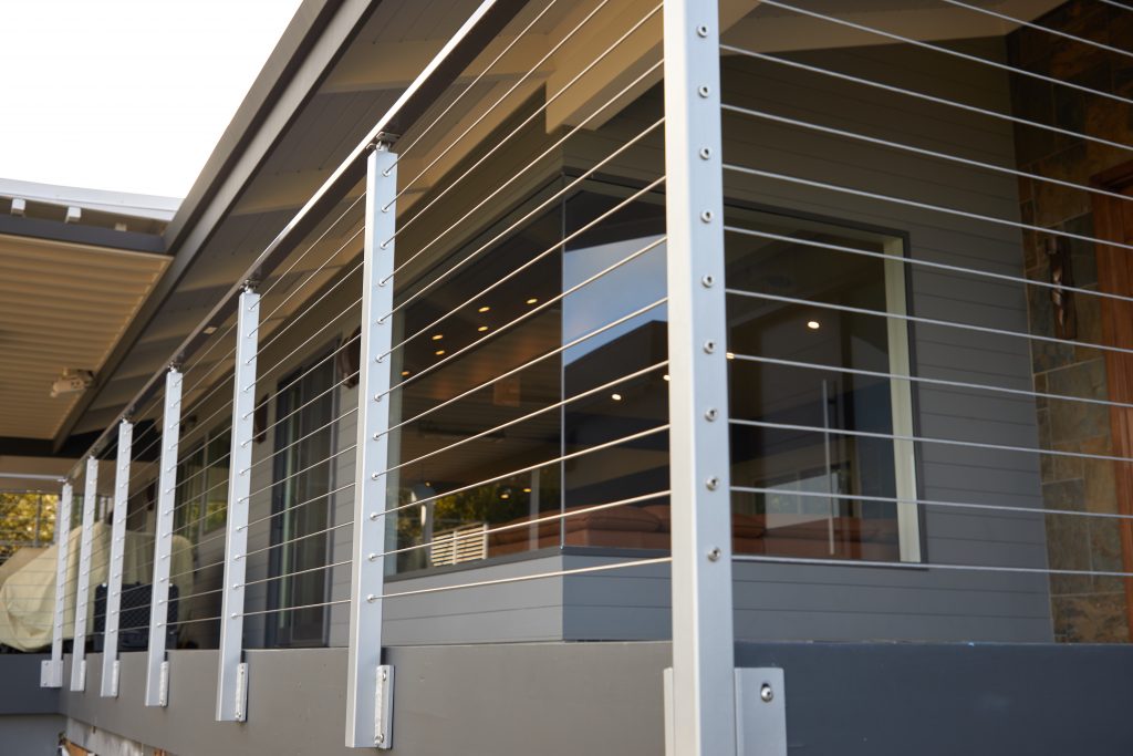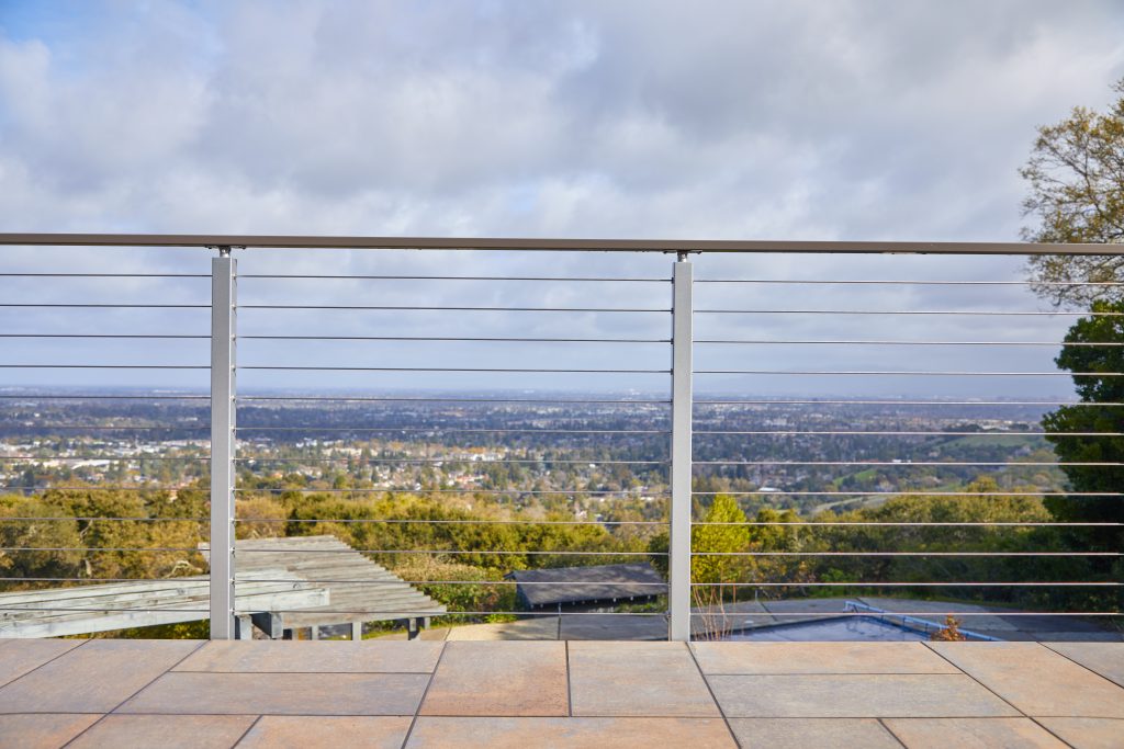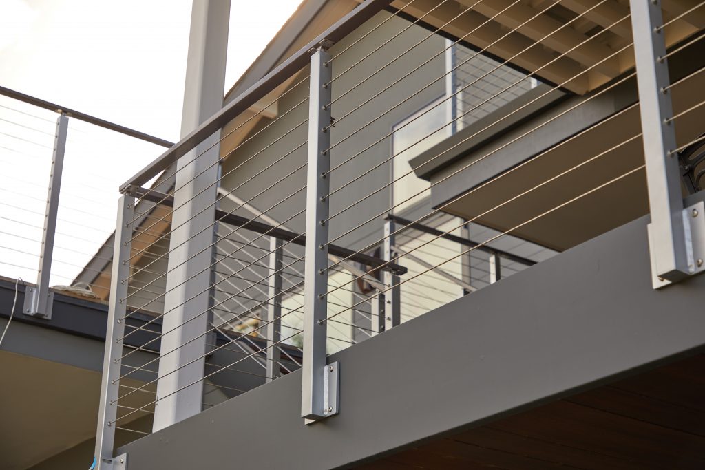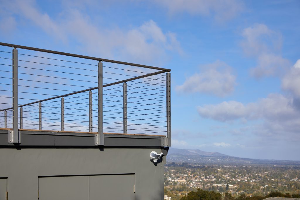 For this larger deck project, the homeowners wanted an extremely strong and durable modern railing solution that didn’t compromise the waterproofing or deck tiling throughout the project. The design specifically incorporated a blocked out fascia board, to which the posts would mount. This project uses Side Mounted Posts that create a 42″ tall cable railing system. Each post is constructed from aircraft grade aluminum and is powder coated with a durable Fluoropolymer Speedboat Silver finish. The long lines and corners of the deck edges go perfectly with the vertical lines and single post corners that the Side Mounted Posts present. As always, the cable railing provides a clean, unobstructed view.