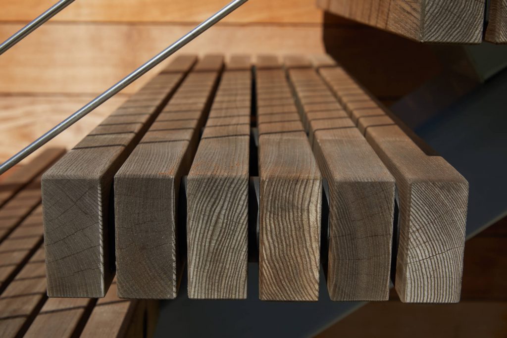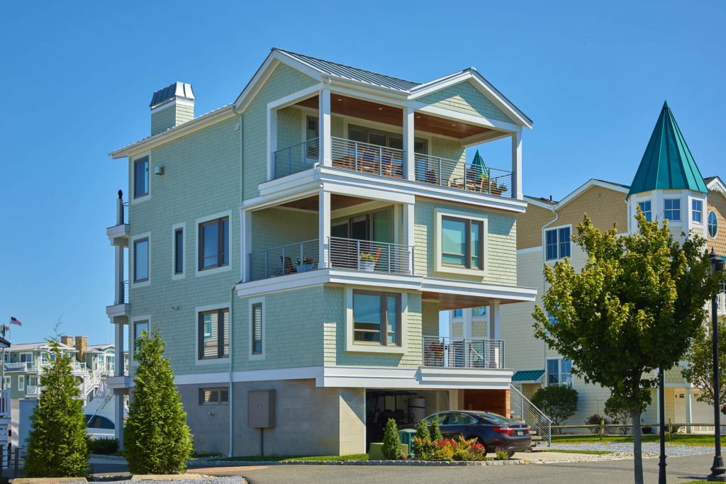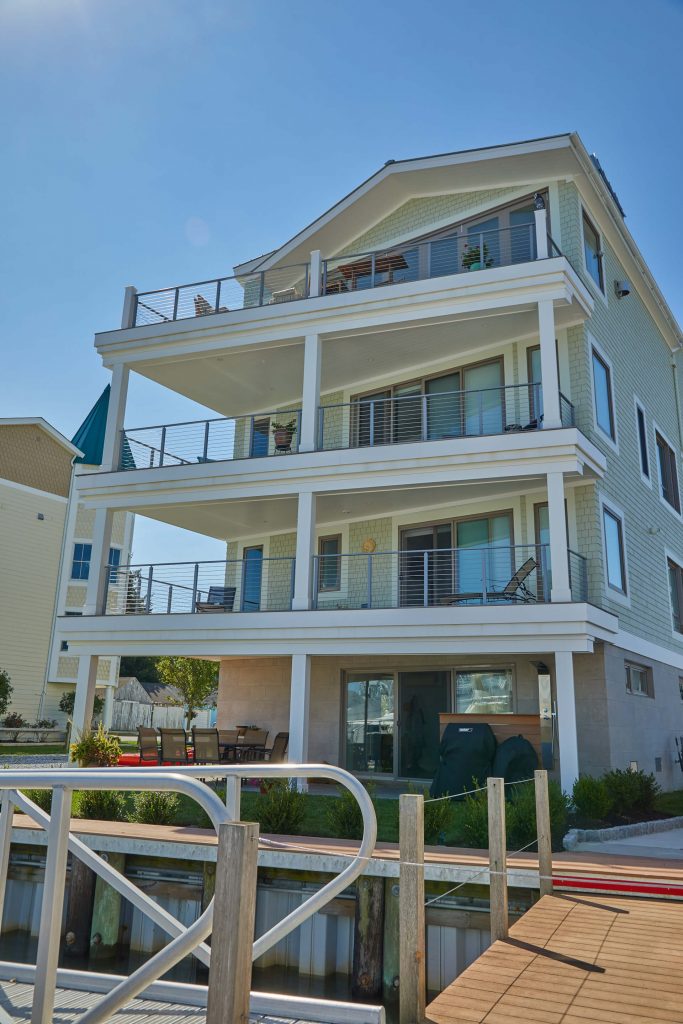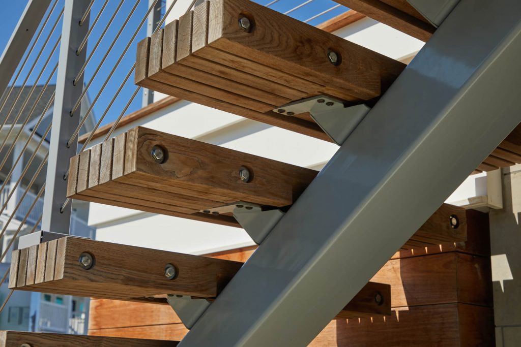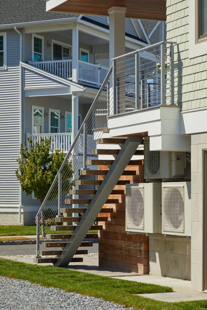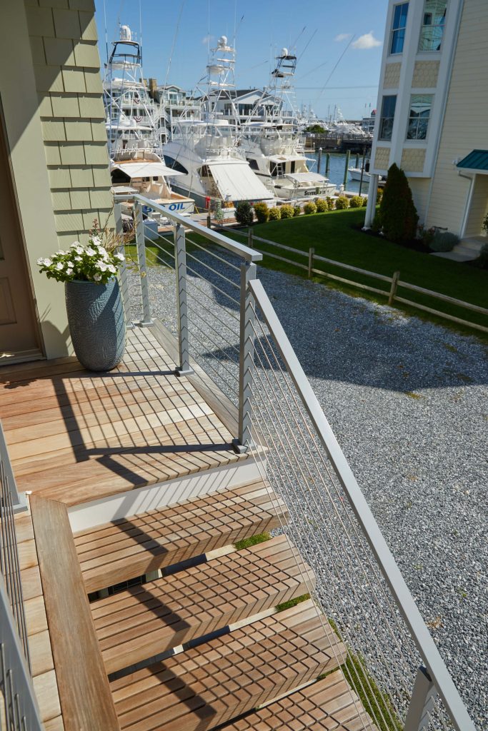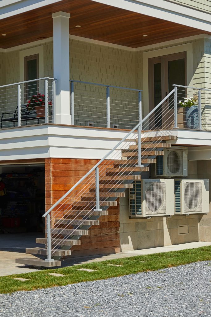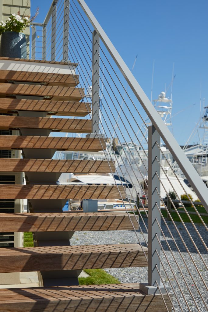 This Cape Cod styled home was built right up on the water of Cape May. The architecture of the structure makes use of the multiple decks and balconies to help open up the space and make the most of the its beautiful setting. Since the house is right up on the ocean, the railings and stairs needed to be durable. The Aluminum posts and Stainless Steel stringer tube are finished with a Fluoropolymer Fashion Gray powder coat which is specifically designed for coastal environments. Constructed from 2205 Stainless Steel, the tensioned 1/4″ diameter rods provide an infill solution for extreme coastal settings. Finally, each thick tread is constructed from thermally treated Endurance hardwood, and utilize a bolt together design that eliminates any need for wood glue outside.