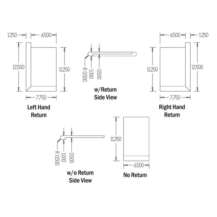 We measure treads in terms of width, depth, & thickness. Without a return, these treads measure 6-1/2″ wide, 11-1/4″ deep, with a 1/2″ thick body, and a 1″ thick bullnose. With a return, they measure a total width of 7-3/4″ wide, and a total depth of 12-1/2″ to account for the size of the return.
