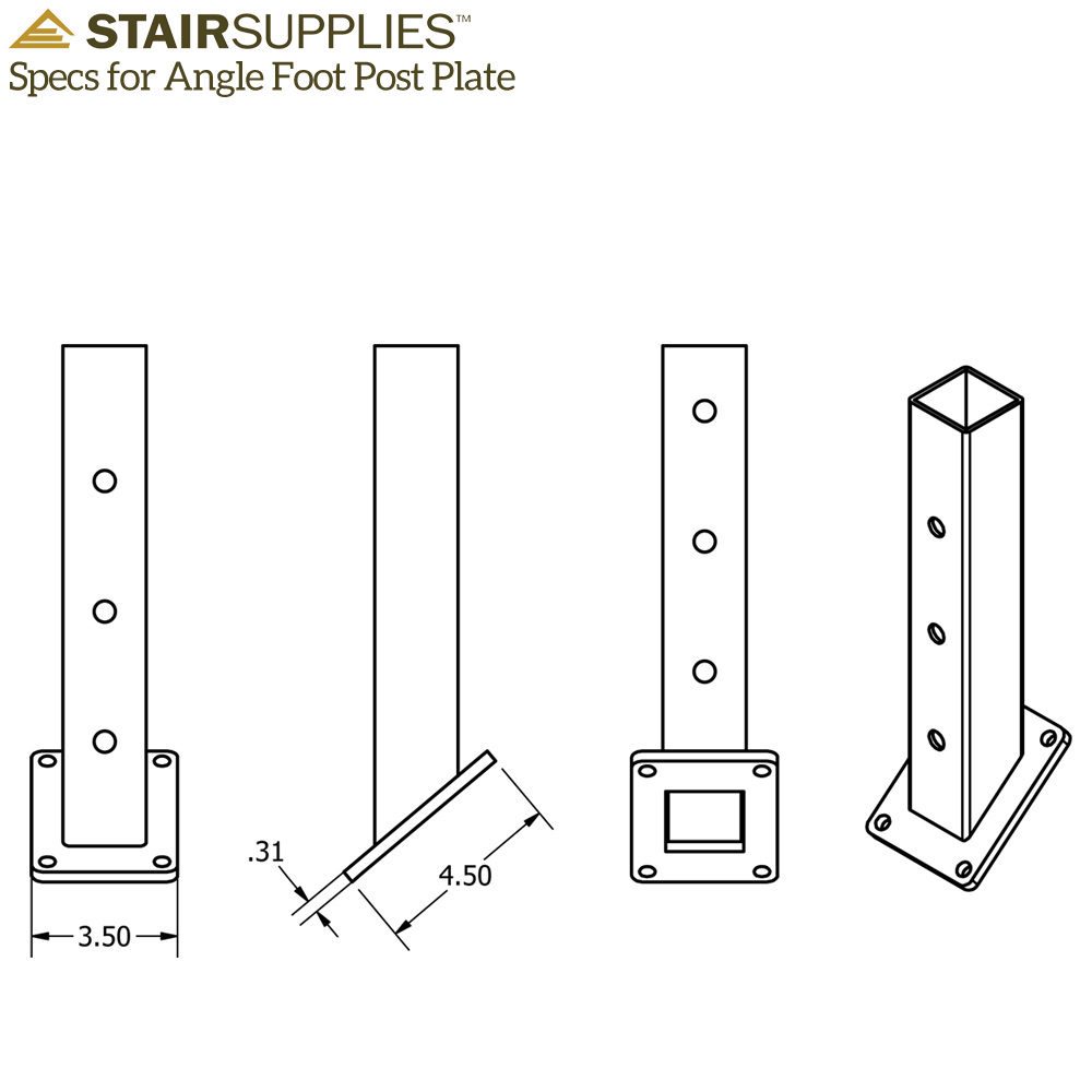 The post is 2″ x 2″ square, the height and number of holes vary depending on your specific height & angle of your kneewall. The foot (mounting plate), is 3 1/2″ wide x 4 1/2″ deep.
