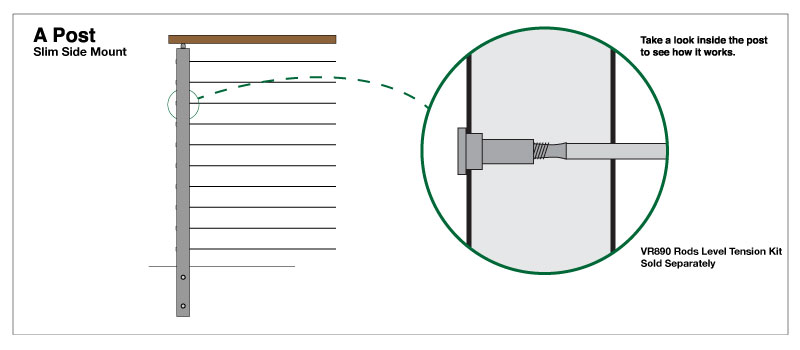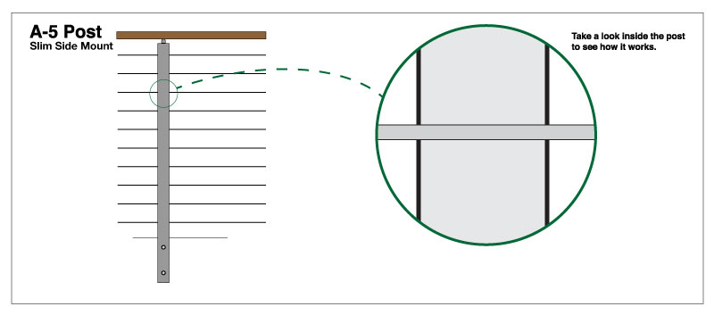 “A-5” – The “A-5″ post is designed to be an intermediate post on level runs. It has level holes drilled on both sides of the post. The rods will simply pass directly through the post, no additional fittings are required.