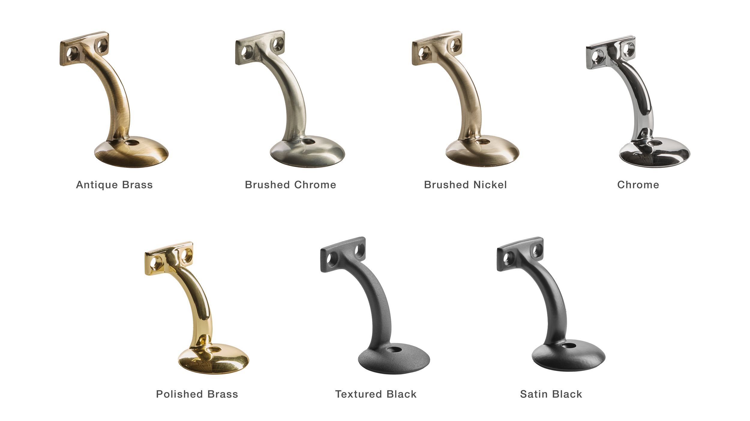 Classic Handrail Brackets has a reach of 2 3/8″ from the wall to the center of the bracket. They come with installation screws that match the finish on the brackets.
