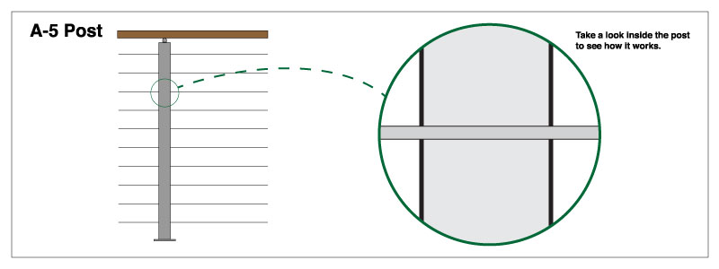 “A-5” – The “A-5″ post is designed to be an intermediate post on level runs. It has level holes drilled on both sides of the post. The rods will simply pass directly through the post, no additional fittings are required.
