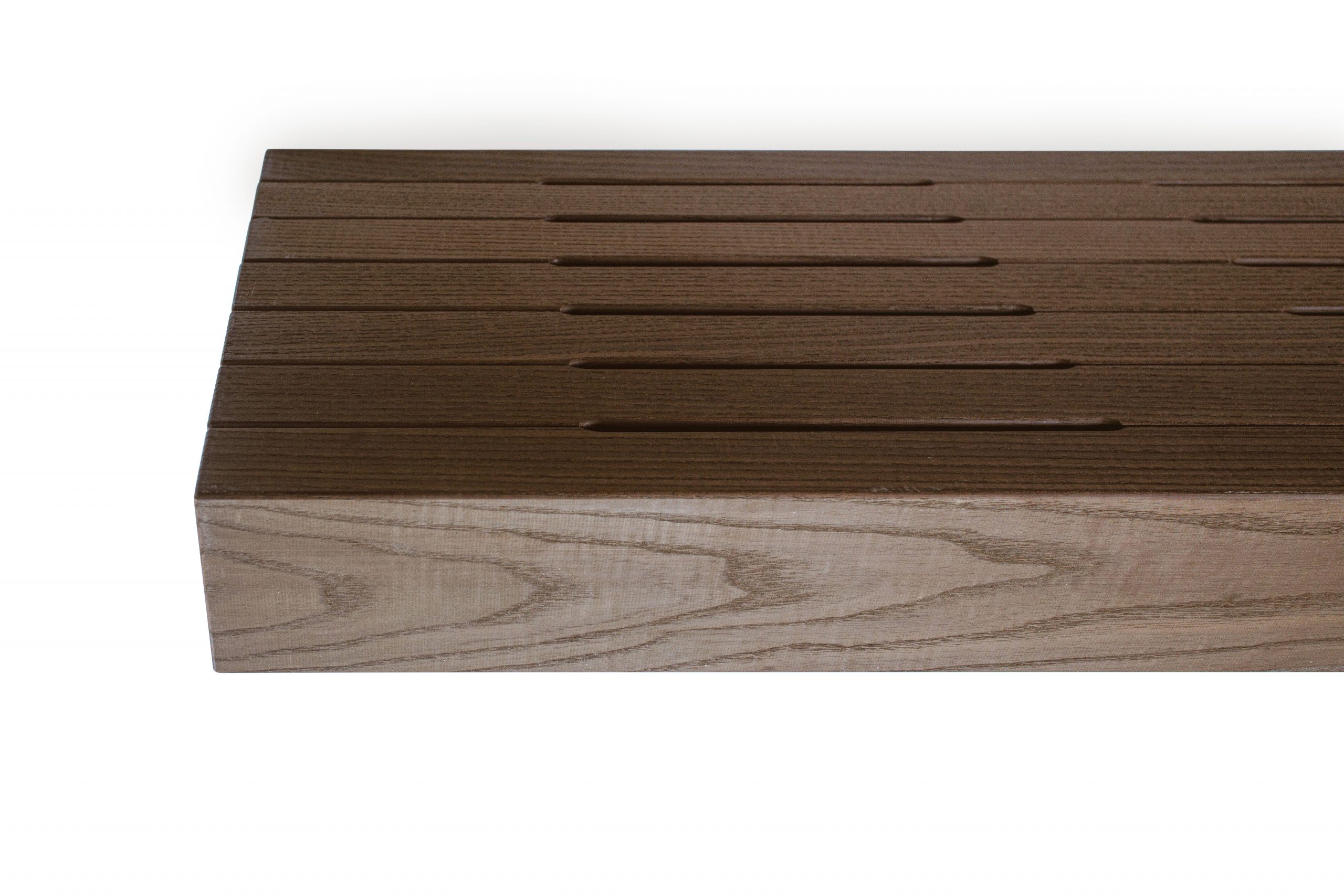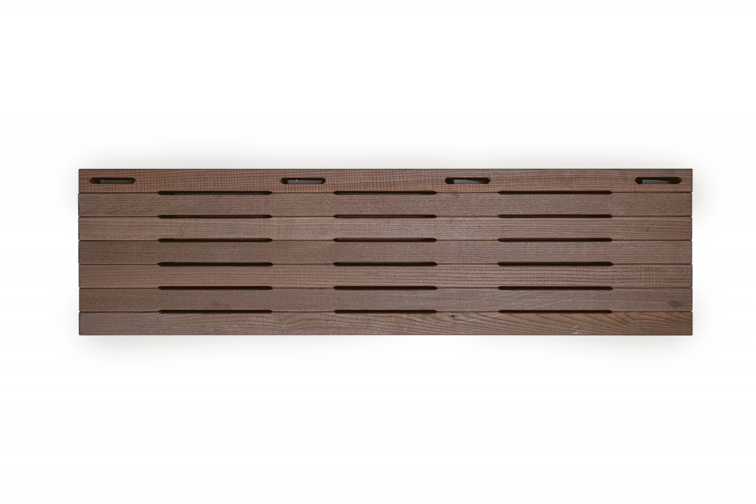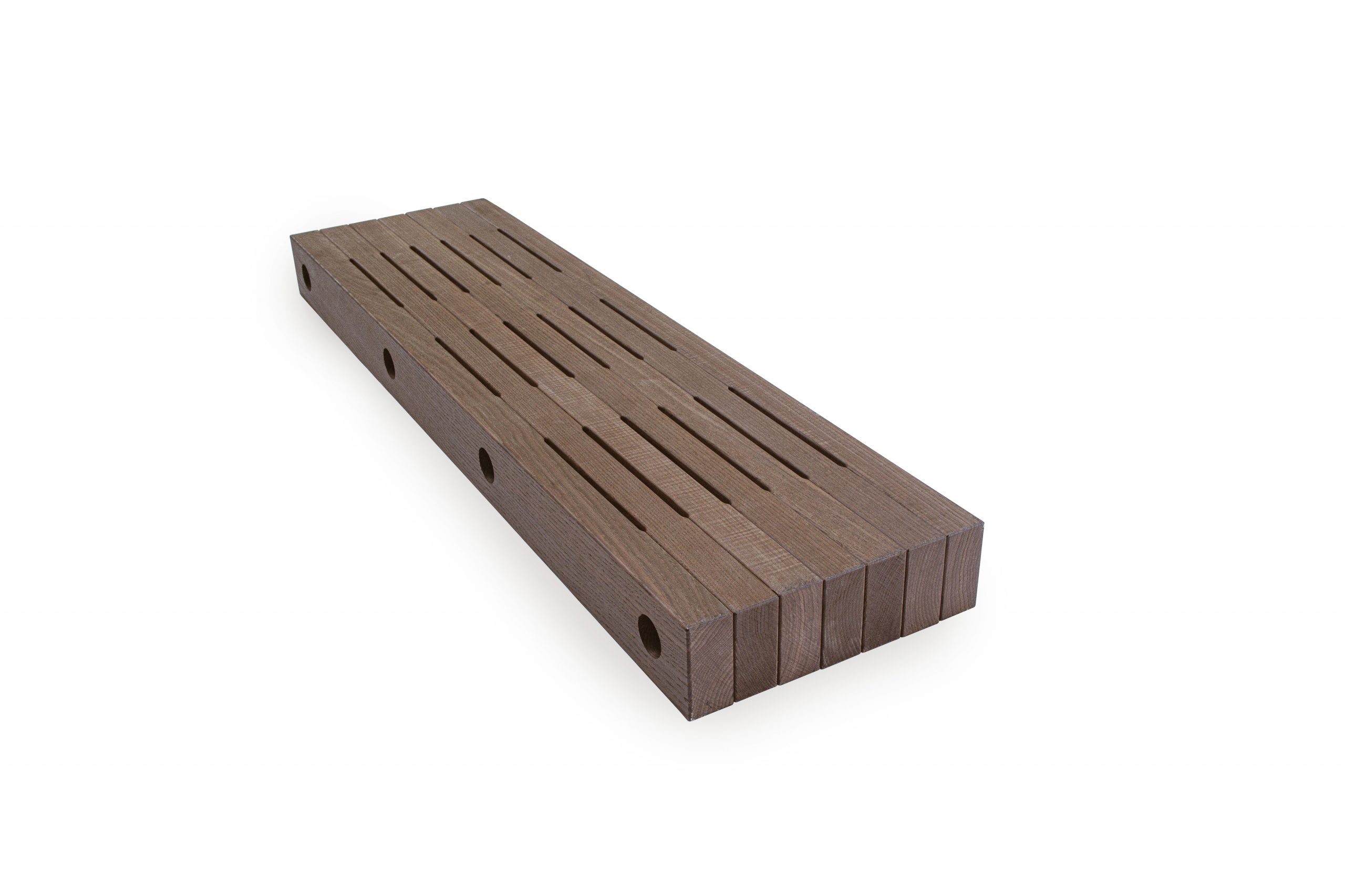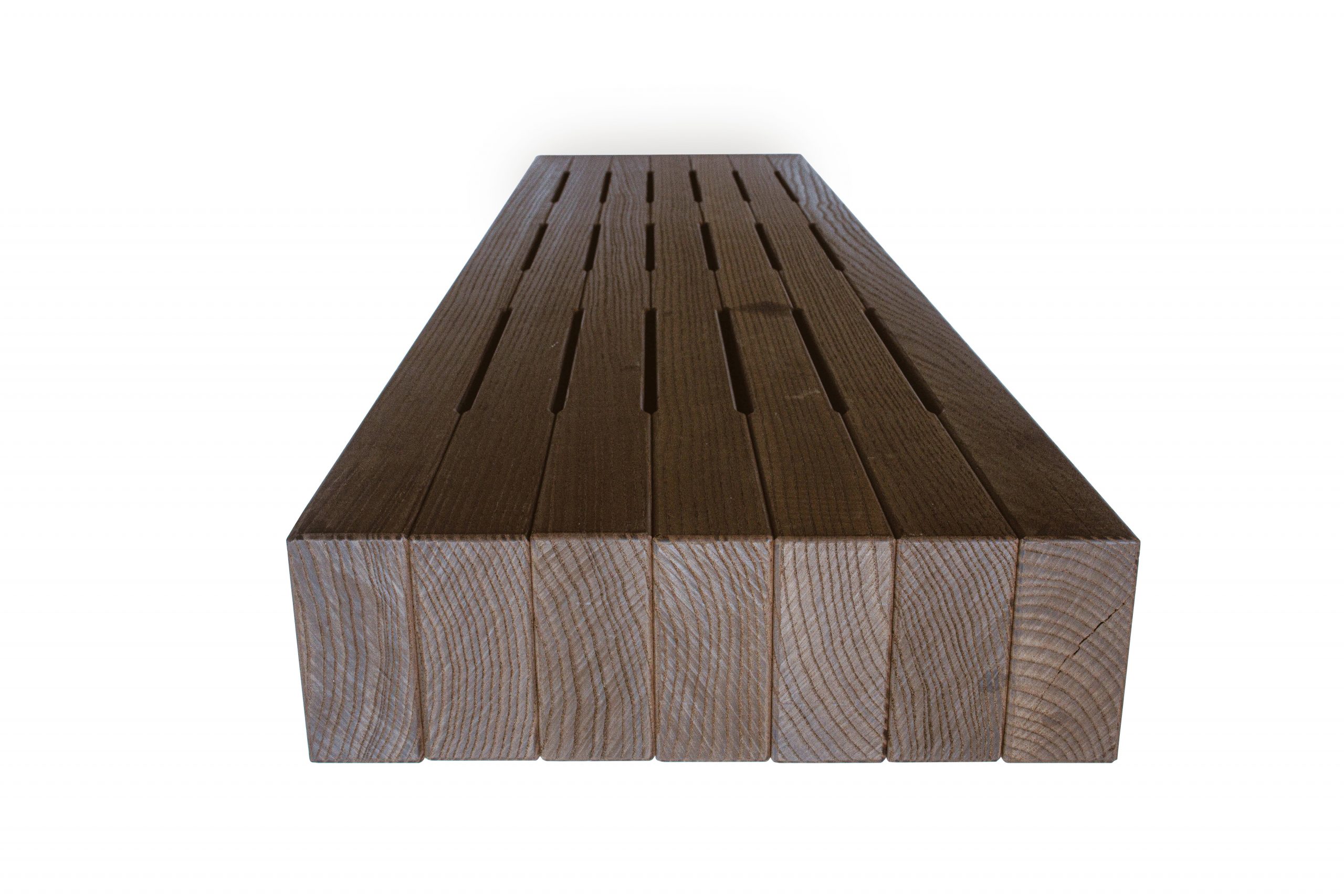 An Endurance Series Tread is the perfect solution if you are looking to achieve a modern, thick tread look on your outdoor stairs or floating staircase. Endurance Treads come in 36”, 42”, and 48” widths and have been thermally modified to resist moisture, rot, mildew, insects, and the elements. The thermal modification process removes all the excess sugars and moisture from the wood, making it ideal for exterior use. The slats in the treads allow water to run through, preventing water damage and rot. Endurance Treads have no glue joints—they are held together with strong bolts which leave no points of weakness. Endurance Treads pair perfectly with Ipe Handrail and Special Application Posts for a complete tread and railing solution.