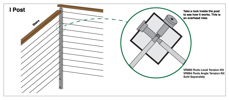 “A-5” – The “A-5″ post is designed to be an intermediate post on level runs. It has level holes drilled on both sides of the post. The rods will simply pass directly through the post, no additional fittings are required.