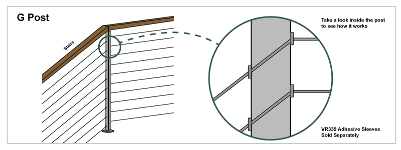 “G” – The “G” post is designed to transition from a stair (angled) section to a level section while maintaining your handrail height. It has 5/16″ holes drilled on opposite sides of the post. Recommended fittings: “Adhesive Sleeve” (20, 22, or 24 sleeves depending on handrail height). Additional Hardware: The Postside Handrail Bracket will make transitioning this handrail much easier.